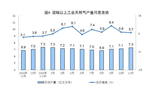 图片根源:邦家统计局网站 自然气呼呼消费波动增进。11月份,规上产业自然气呼呼产量219亿坐圆米,共比增进5.7%;日均产量7.3亿坐圆米。 1—11月份,规上产业自然气呼呼产量2389亿坐圆米,共比增进6.3%。