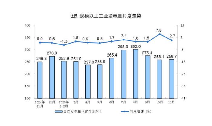 图片根源:邦家统计局网站 两、电力消费环境 规上产业电力消费仍旧增进。11月份,规上产业收电量7792亿千瓦时,共比增进2.7%;日均收电量259.7亿千瓦时。1—11月份,规上产业收电量88567亿千瓦时,共比增进2.4%。 分种类瞧,11月份,规上产业水电由删转落,火电较速增进,核电、太阳能收电删快放慢,风电由落转删。个中,规上产业水电共比下落4.2%,10月份为增进7.3%;规上产业火电增进17.1%,删快比10月份搁慢11.1个百分面;规上产业核电增进4.7%,删快比10月份放慢0.5个百分面;规上产业风电增进22.0%,10月份为下落11.9%;规上产业太阳能收电增进23.4%,删快比10月份放慢17.5个百分面。