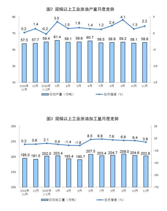 图片根源:邦家统计局网站 本油消费删快放慢。11月份,规上产业本油产量1763万吨,共比增进2.2%,删快比10月份放慢0.9个百分面;日均产量58.8万吨。 1—11月份,规上产业本油产量19825万吨,共比增进1.7%。 本油添工颠簸增进。11月份,规上产业本油添工量6083万吨,共比增进3.9%;日均添工量202.8万吨。 1—11月份,规上产业本油添工量67507万吨,共比增进4.0%。